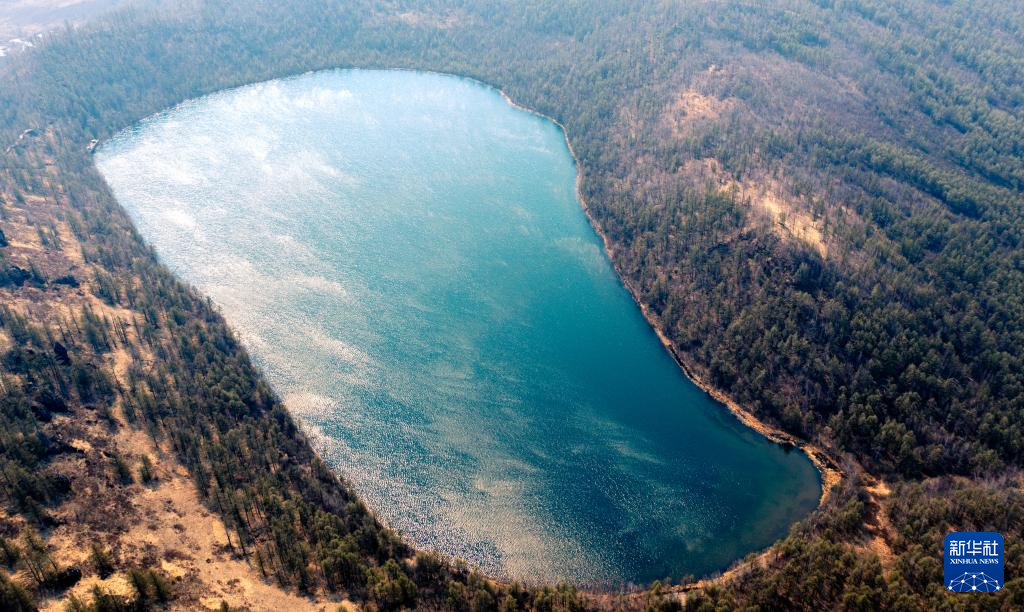 這是5月20日在內蒙古阿爾山國家森林公園拍攝的駝峰嶺天池(無人機照片)。