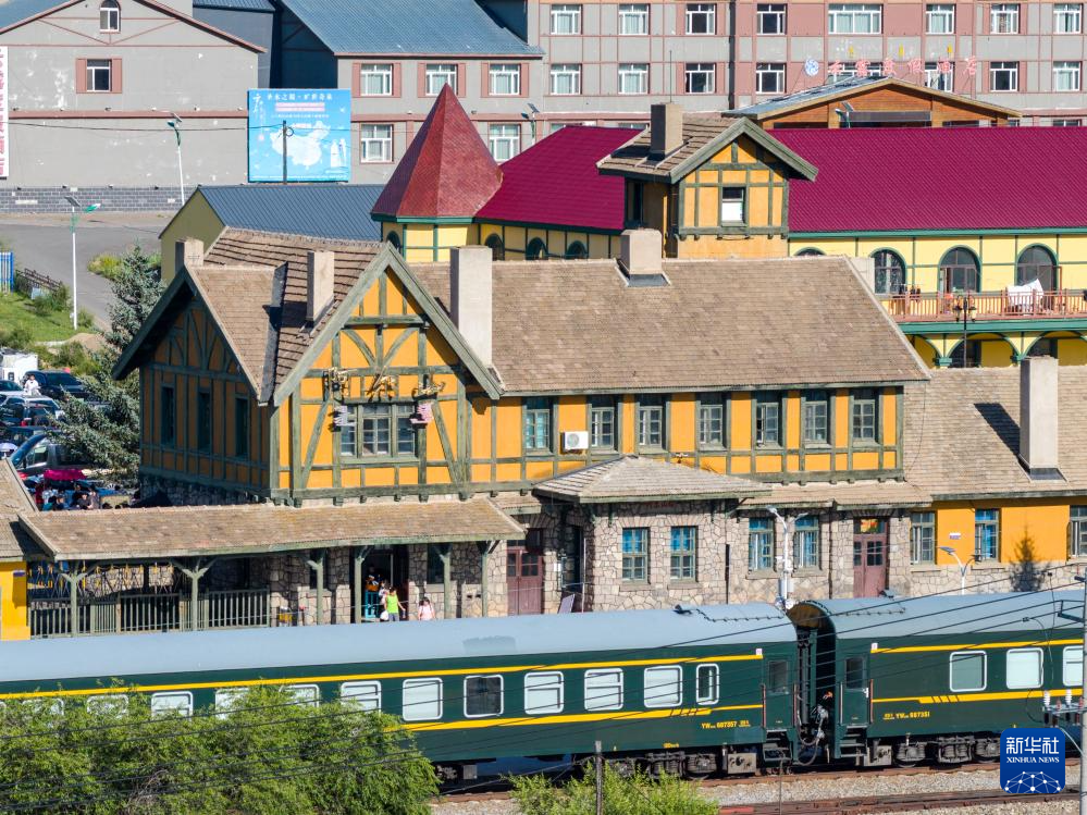 7月27日,一列火車駛出阿爾山火車站(無人機照片)。