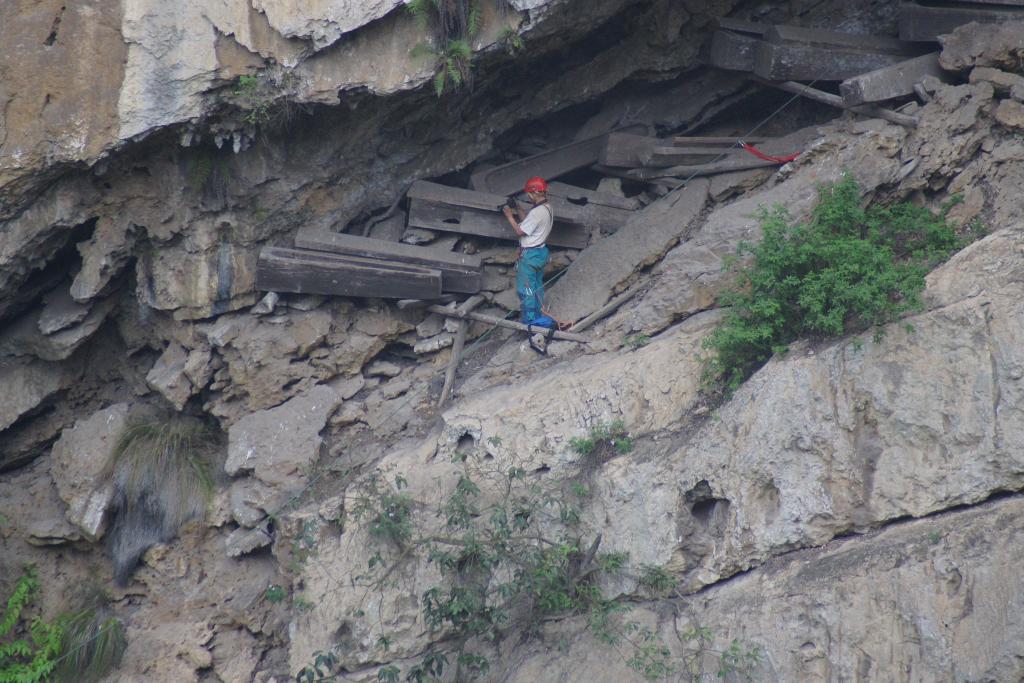 在云南昭通,考古人員在觀察記錄懸棺葬(資料照片)。新華社發