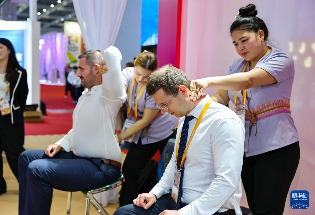 11月5日,人們在第八屆進博會國家展泰國館體驗泰式按摩。