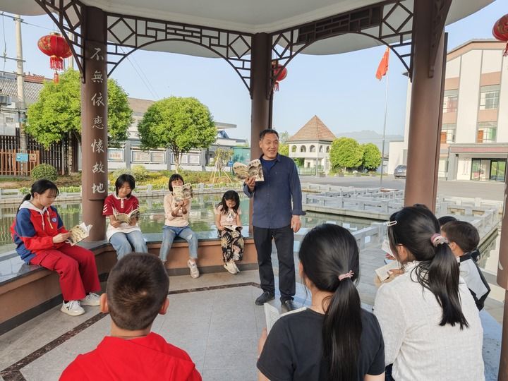 2025年4月23日,浙江衢州白沙村舉辦世界讀書日活動,一位白沙村村民給當地小學生講村志里的故事。新華社記者 魏董華 攝