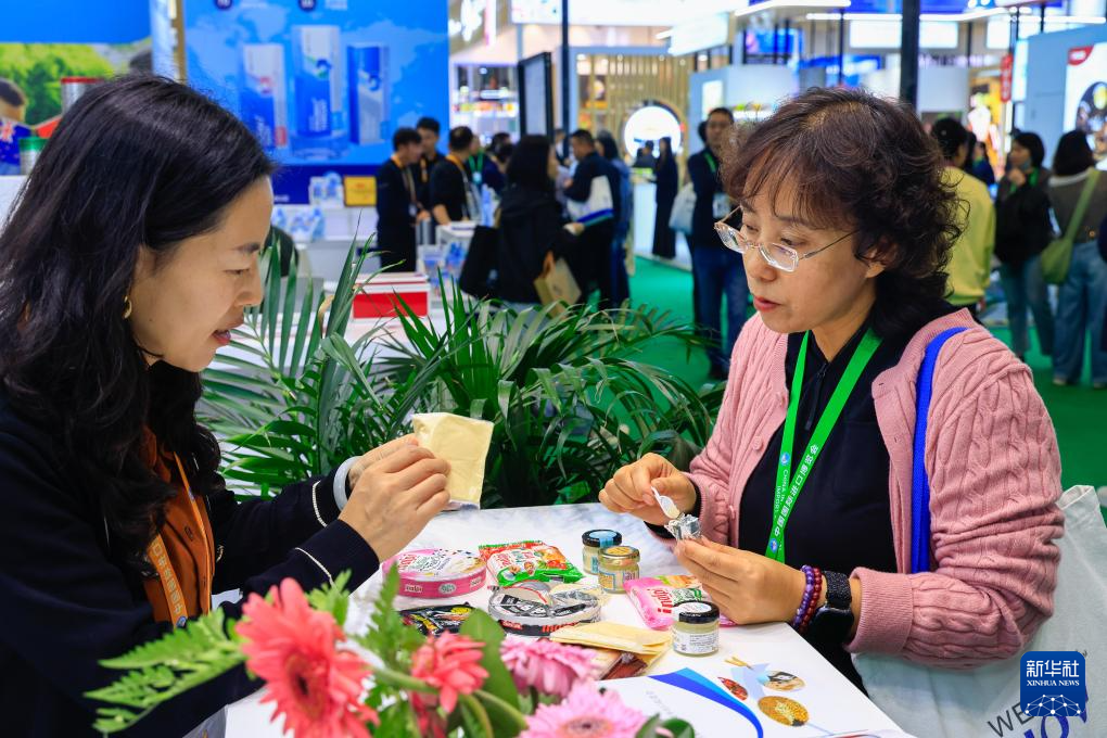 11月9日,在第八屆進博會農食產品展區,參觀者(右)品嘗意大利伊納爾皮集團(Inalpi)的奶酪。