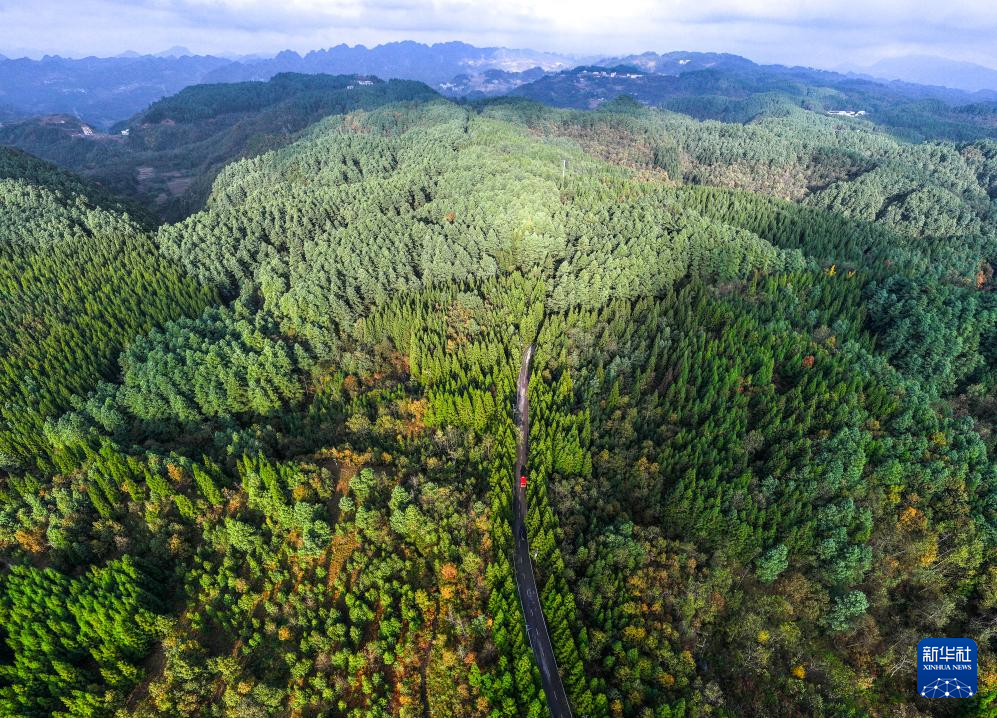 張建、張華、張忠與同事駕駛森林巡防車(橙色車輛)在貴州省畢節市七星關區拱攏坪國有林場巡山護林(11月13日攝,無人機照片)。