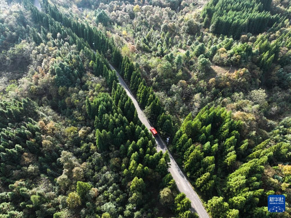 張建、張華、張忠與同事駕駛森林巡防車在貴州省畢節市七星關區拱攏坪國有林場巡山護林(11月13日攝,無人機照片)。