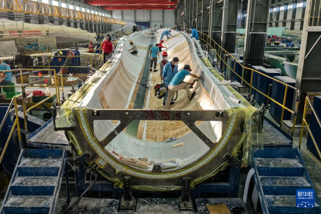 11月20日,在甘肅省酒泉經濟技術開發區的甘肅九鼎風電復合材料有限公司成型車間,工作人員進行風機葉片鋪層作業(無人機照片)。